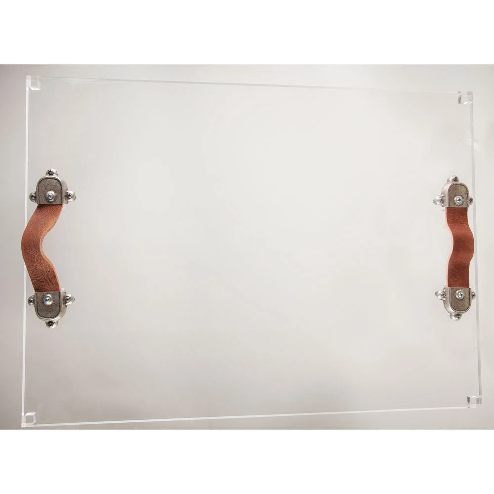 This versatile acrylic flat tray with leather handles is perfect to serve cocktails, display flowers, or set on an ottoman to create an instant side table.
