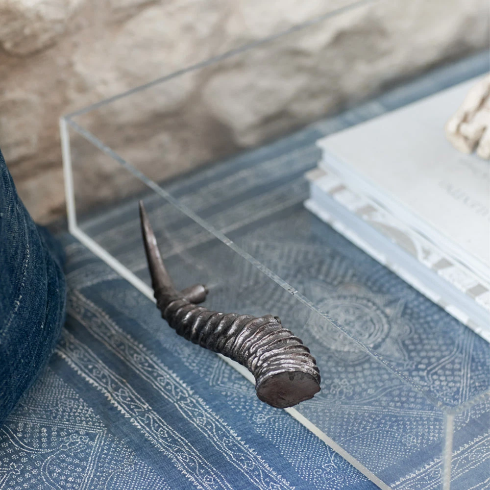 Both practical and chic this tray partners modern acrylic with timeless horn handles. Perfect for gathering drinks, magazines, or a pile of loose antlers.