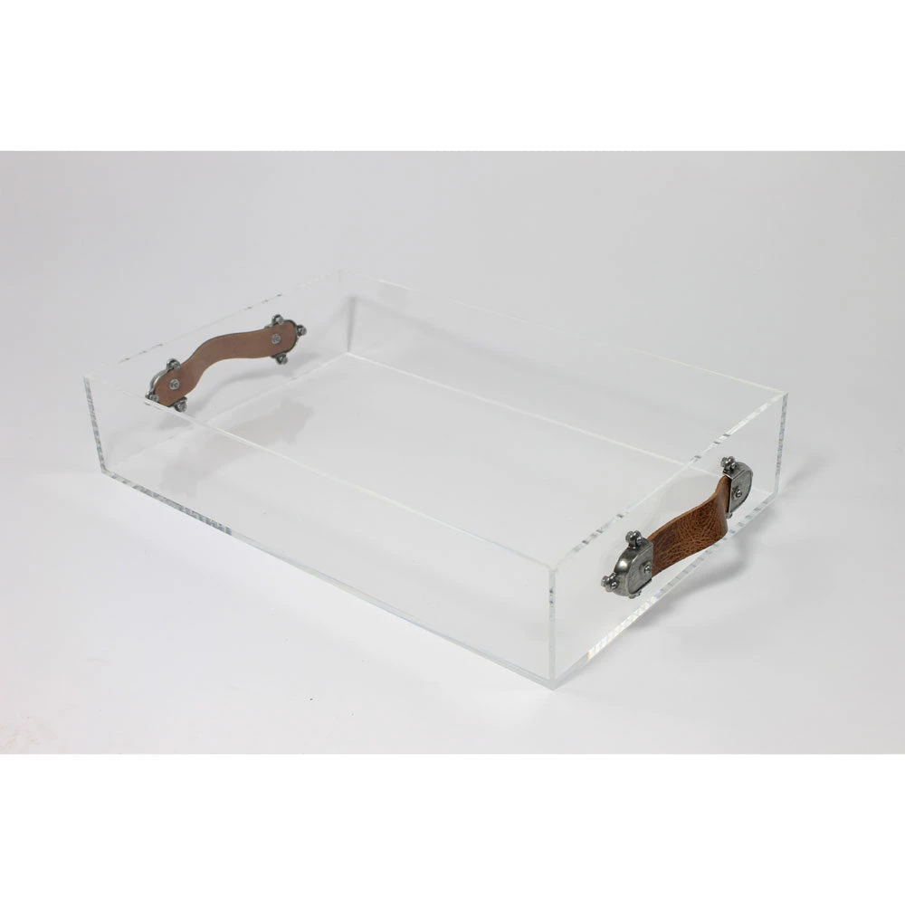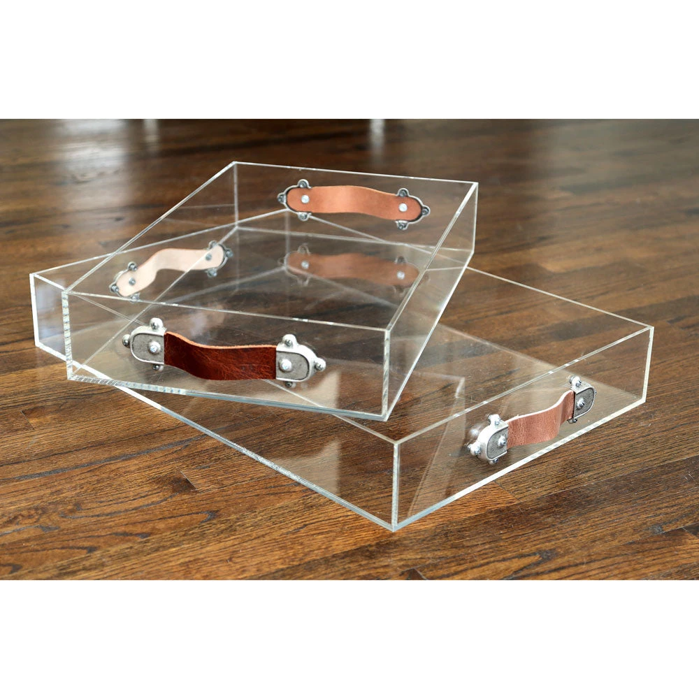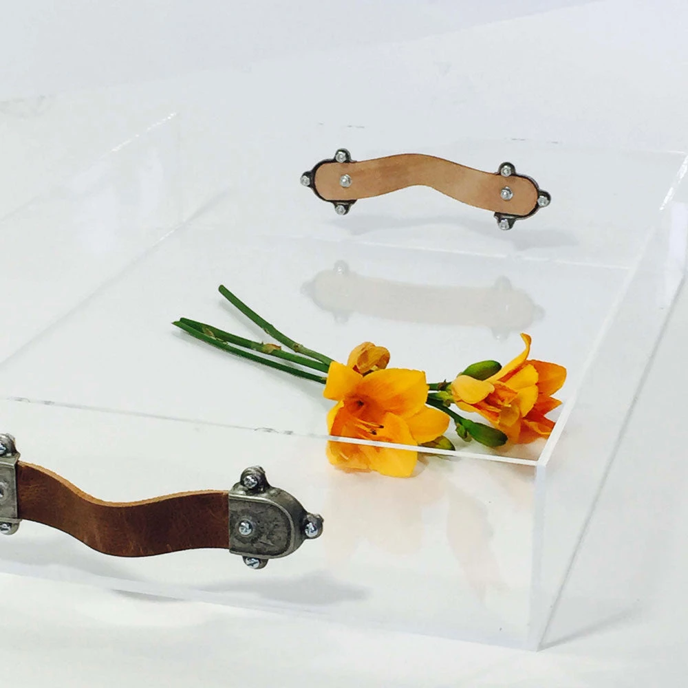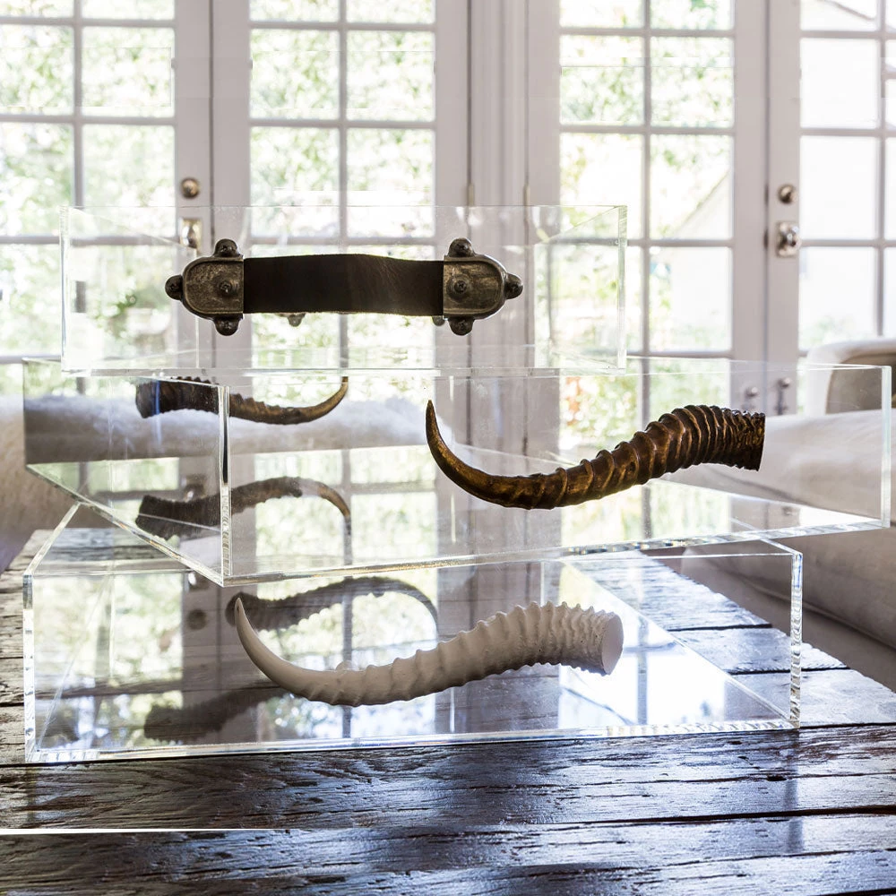 Both practical and chic this tray partners modern acrylic with leather handles. Perfect for gathering drinks, magazines, or a pile of loose antlers.