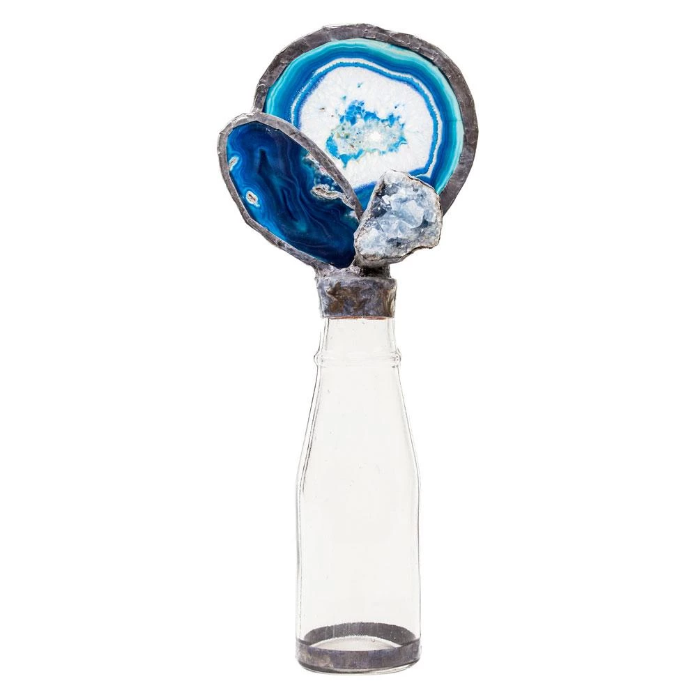 Each slice of genuine agate reveals its own unique characteristics of color, shape and organic patterns. With its colorful blue hues, this hand embellished bottle is sure to be eye catching.