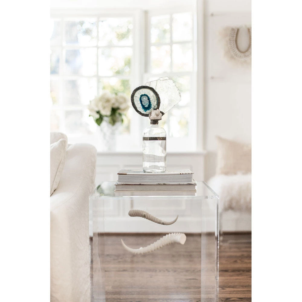Each slice of genuine agate reveals its own unique characteristics of color, shape and organic patterns. With its colorful blue hues, this hand embellished bottle is sure to be eye catching.