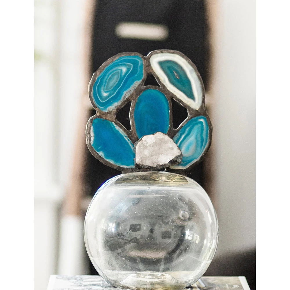 Each slice of genuine agate reveals its own unique characteristics of color, shape and organic patterns. With its colorful blue/aqua hues, this hand embellished float is sure to be eye catching.