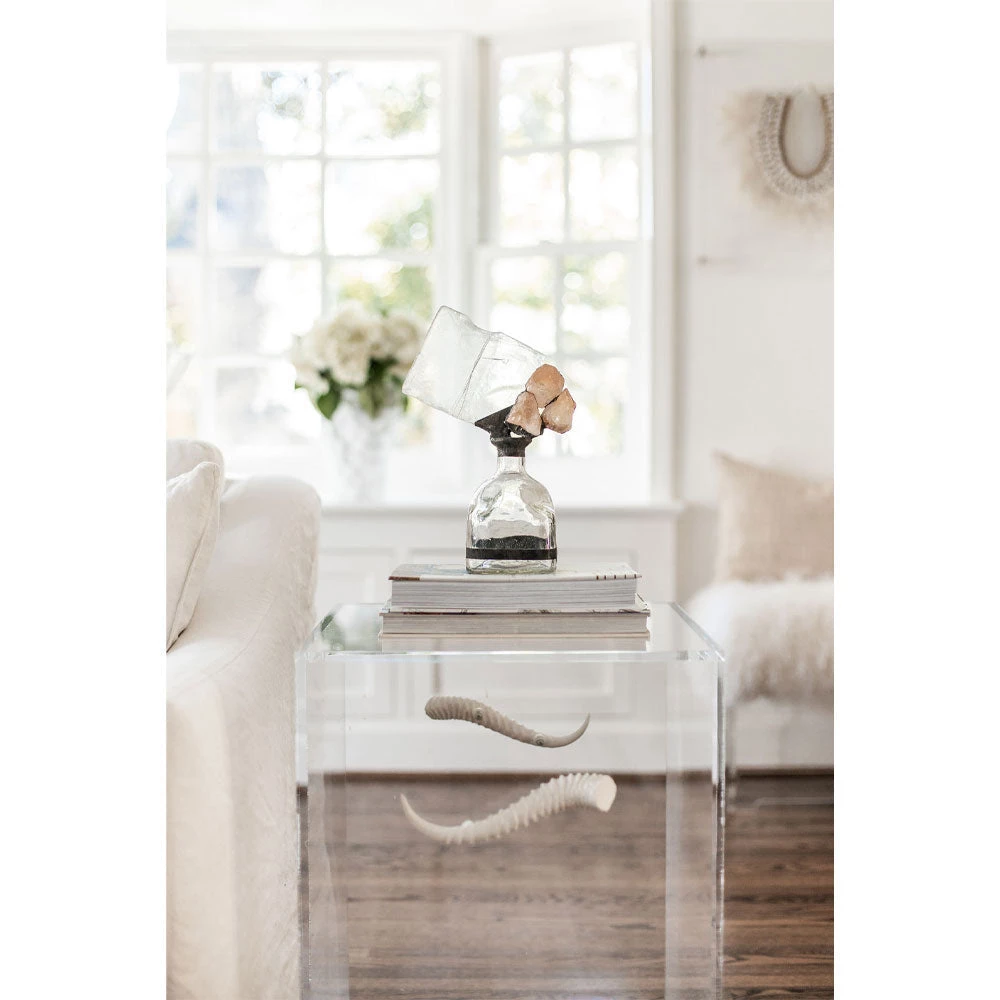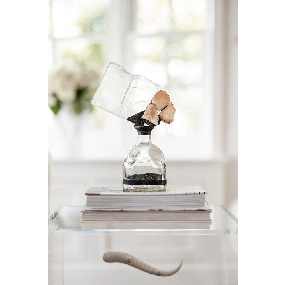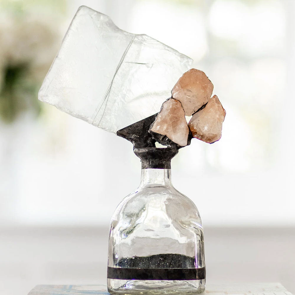 This striking bottle is hand embellished with selenite slab, citrine stone. With its unique modern design, and organic feel, its sure to add character to any room.