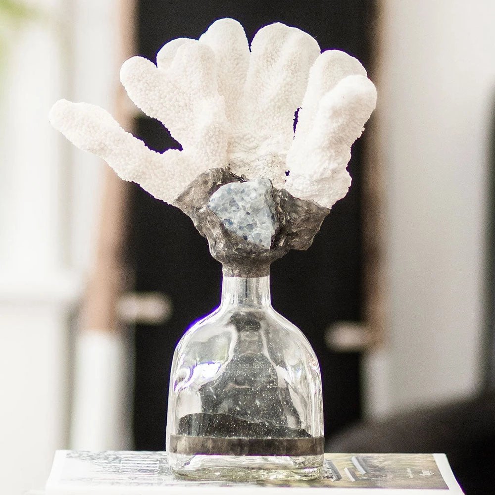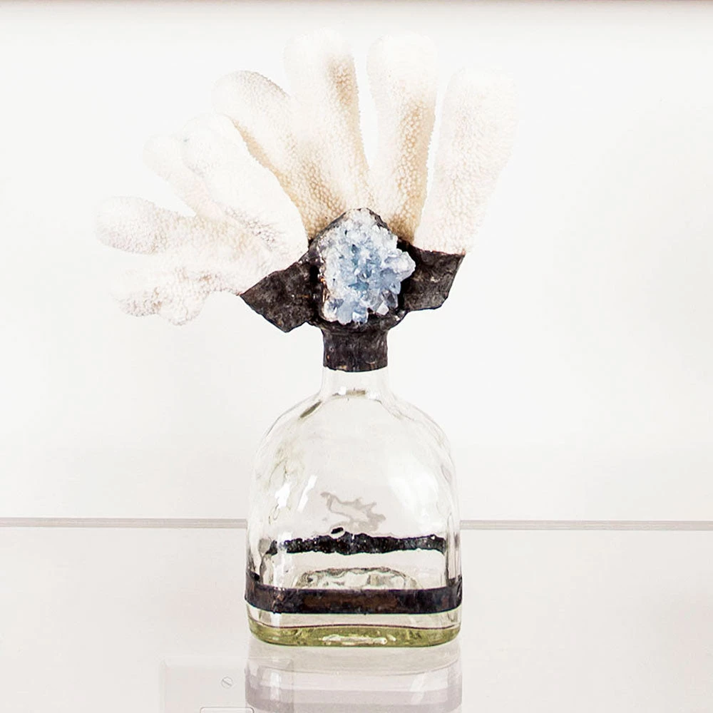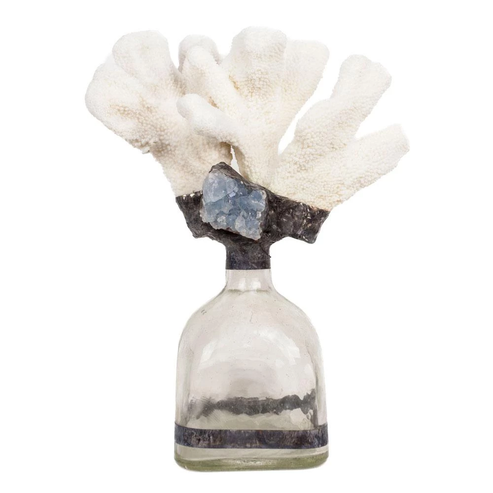 Add an organic element to a mantel or table with this clear bottle embellished with White Coral and Blue Calcite. With its detailed texture and natural shape, it’s sure to be an eye-catching accent.