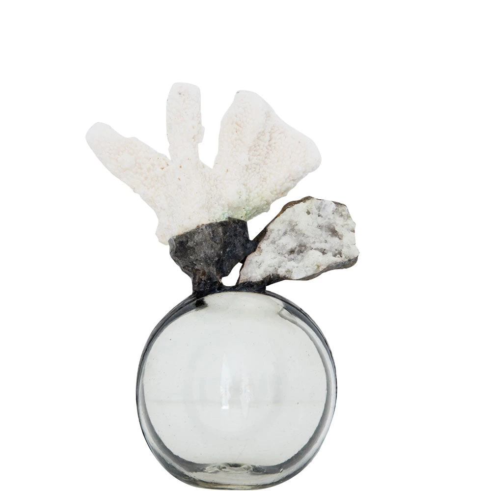 This round glass float embellished with White Coral and Geode has a cool and coastal vibe. We love the simple look of a glass bottom with the natural sealife and stones on top. This classy piece is a perfect addition to any room.