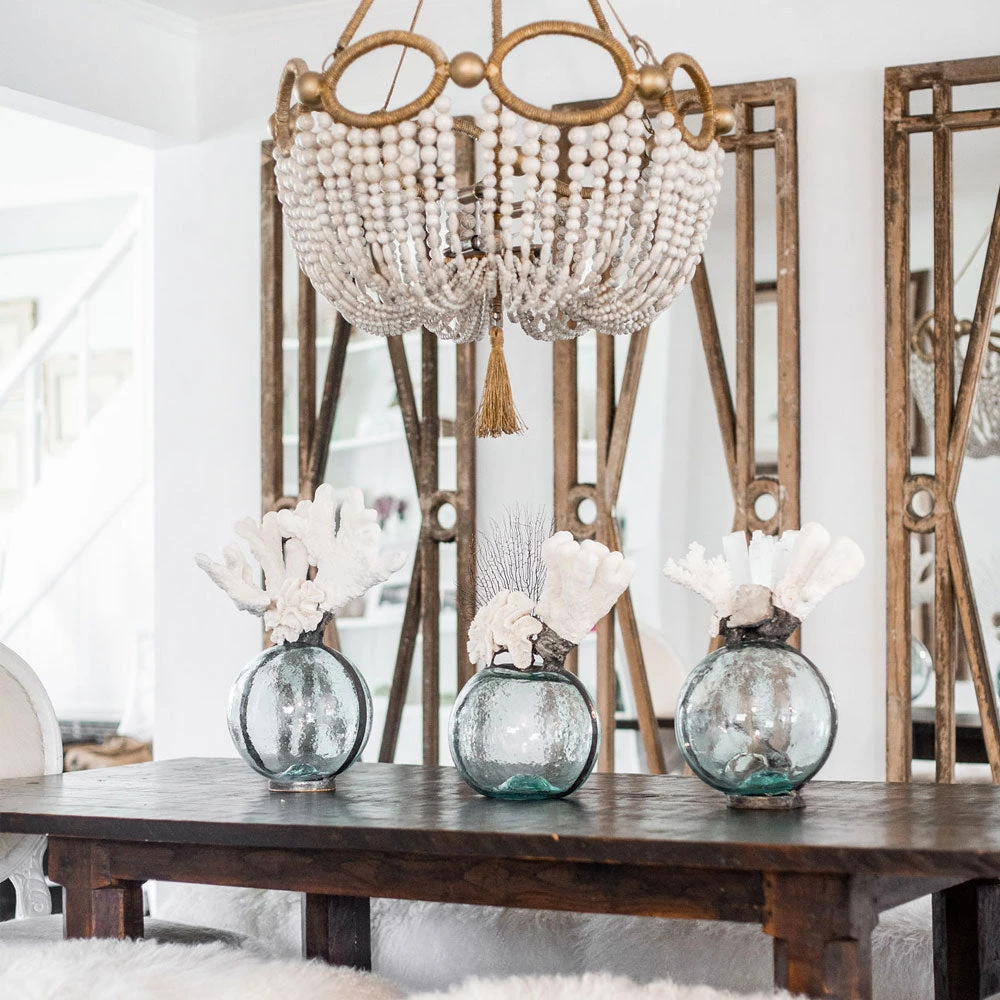 This large round glass float embellished with White Coral, Geode and Selenite is uniquely classy. The Selenite gives this float a modern coastal look. Add this piece to any room in the house for a gorgeous look.