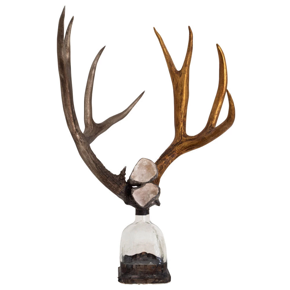 Our Double Large Antler Bottle strikes a uniquely elegant design with a modern twist. It features 2 large antlers with hand embellished crystals and stones. This timeless piece will steal the spotlight wherever you place it.