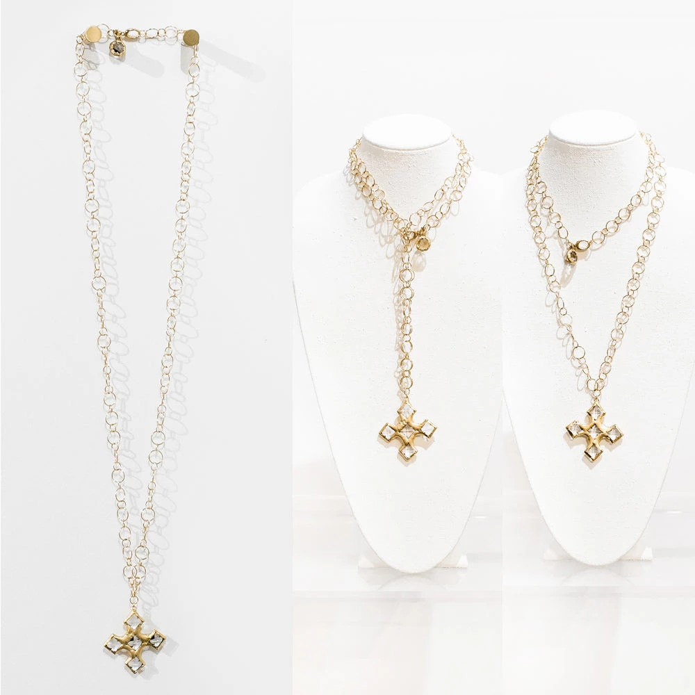 Our Elena necklace is hand crafted in the USA, and hand dipped in 18 karat gold. It can be worn 3 ways as shown. It’s a are part of our “Making a Difference” line, which means Jamie Dietrich will donate 5% of the sale of this piece to her favorite charity.