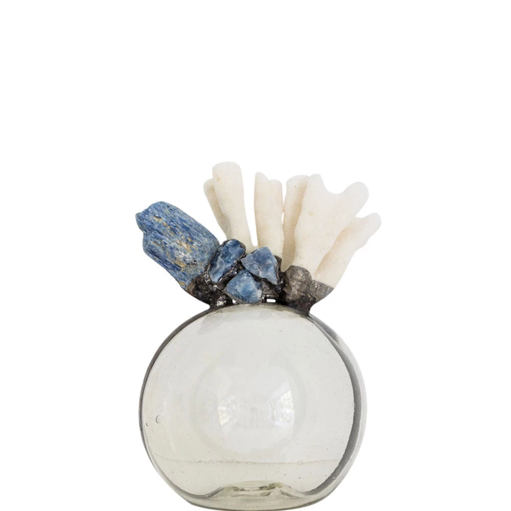 This medium round glass float embellished with White Coral and Blue Kyanite has a modern coastal vibe. We love the simple look of a glass bottom with the natural sealife and stones on top. This classy piece is a perfect addition to any room.