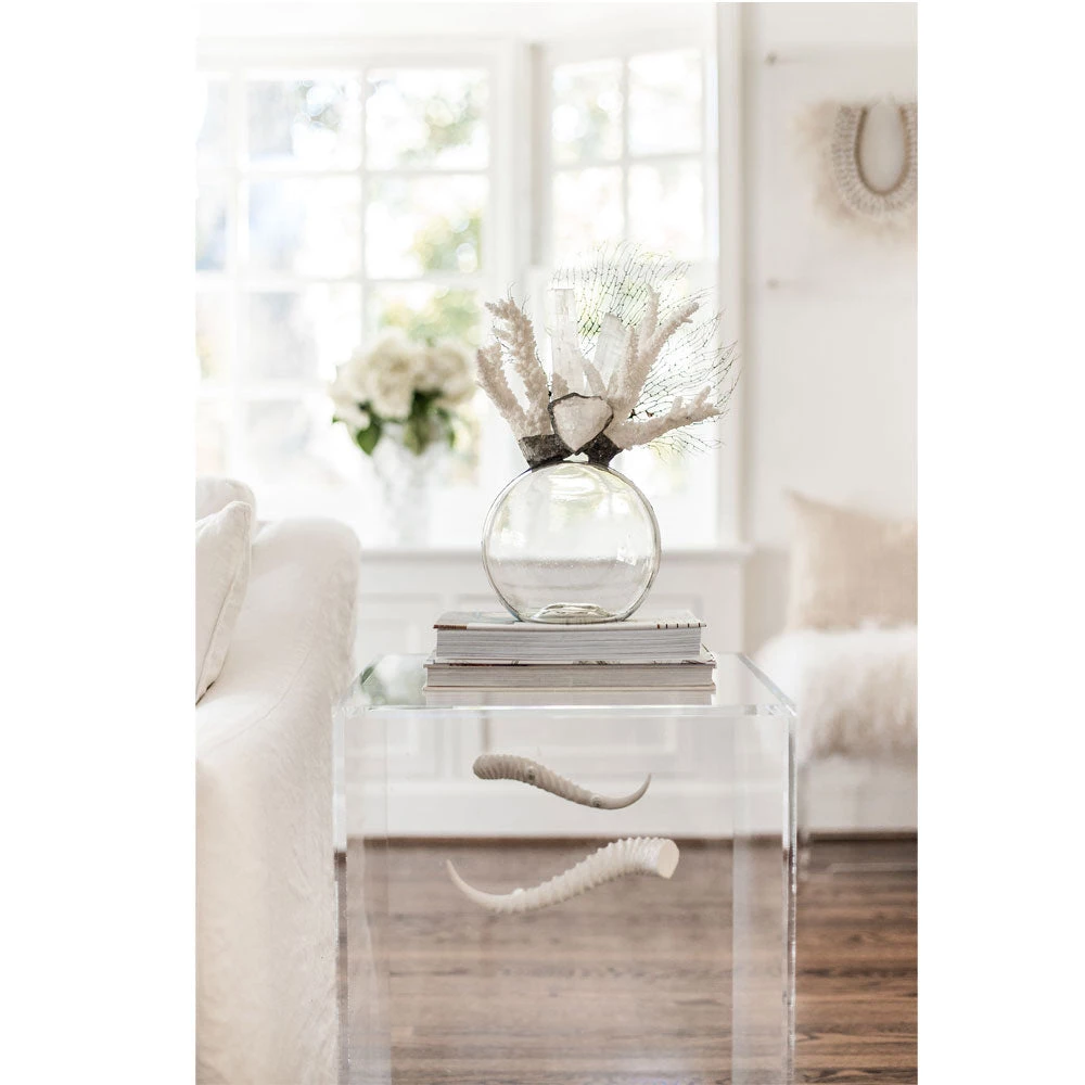 This round glass float embellished with White Coral, Seafan, and Selenite has a modern coastal vibe. We love the simple look of a glass bottom with the natural sealife and minerals on top. This classy piece is a perfect addition to any room.