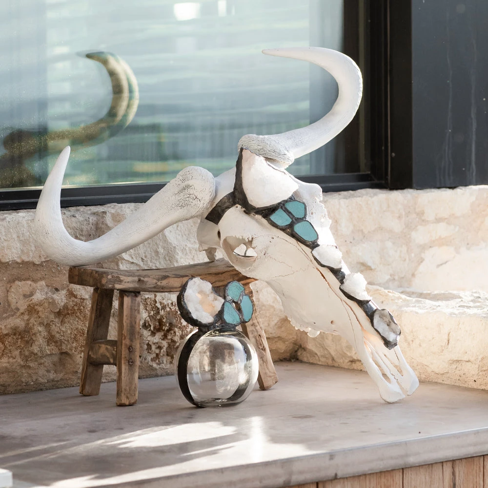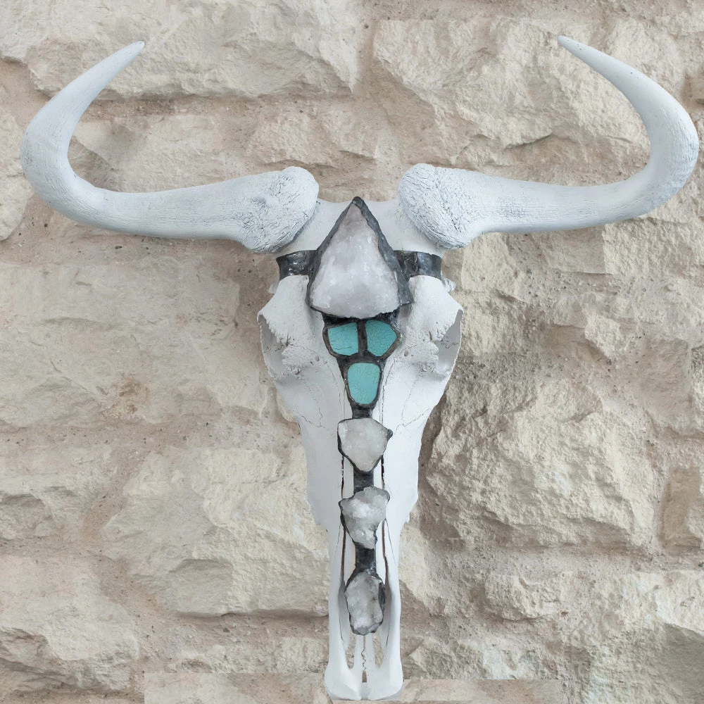 Looking for a unique and eye-catching piece for your home? Our authentic South African Wildebeest Skull will have your guests talking! Embellished with geodes and Turquoise stones. White colored horns.