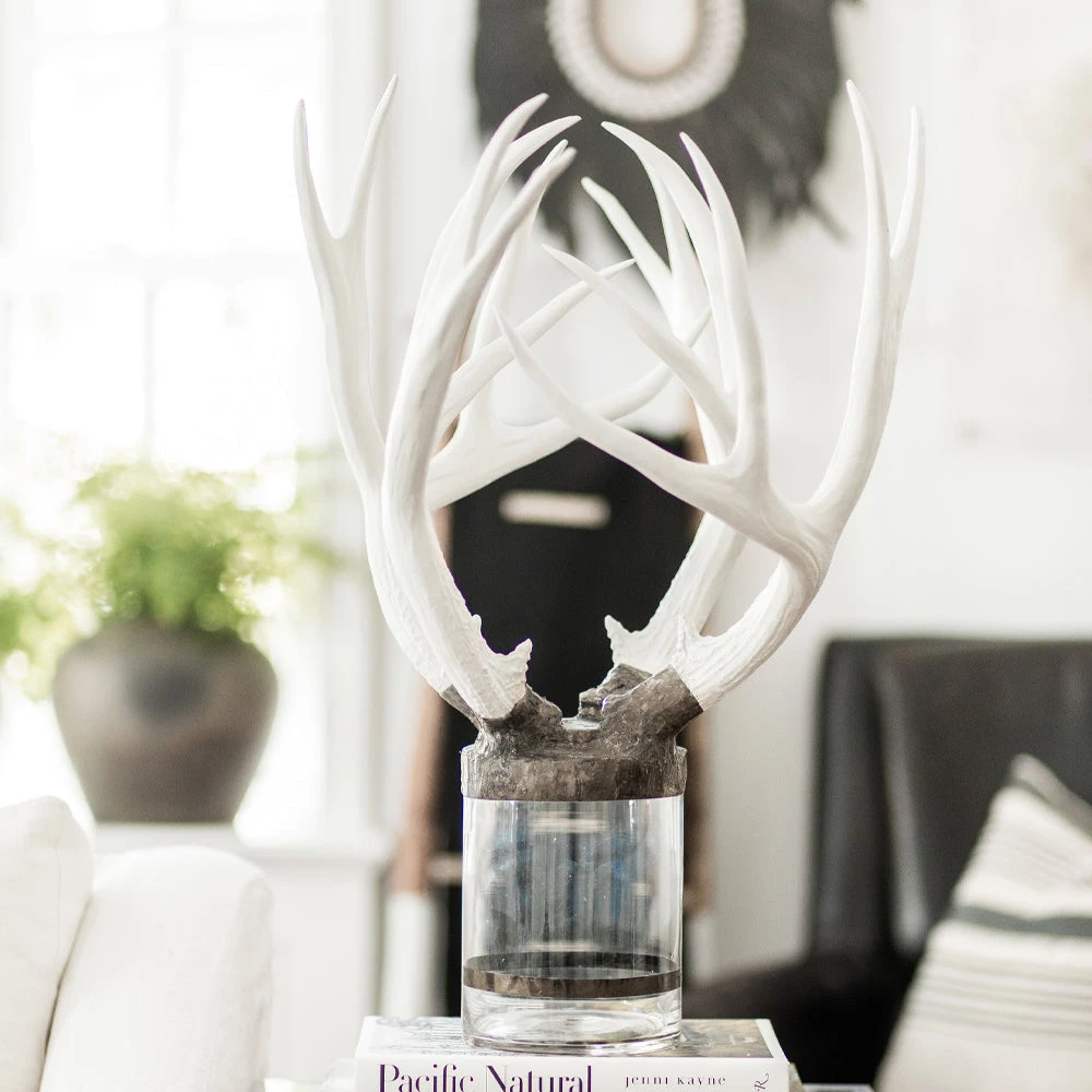 Our uniquely designed Mixed Antler Bottle is elegant and rustic at the same time It features a mix of multiple large antlers on a large cylinder bottle. This bottle is truly a statement piece.