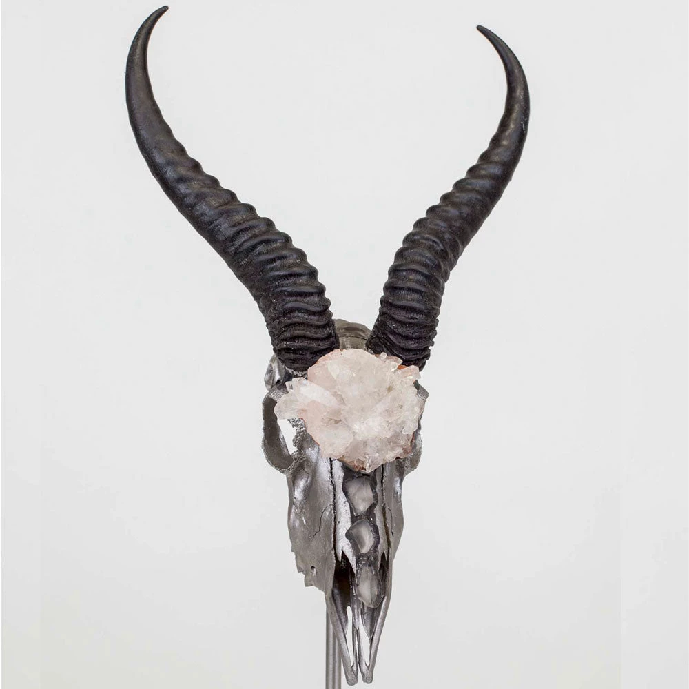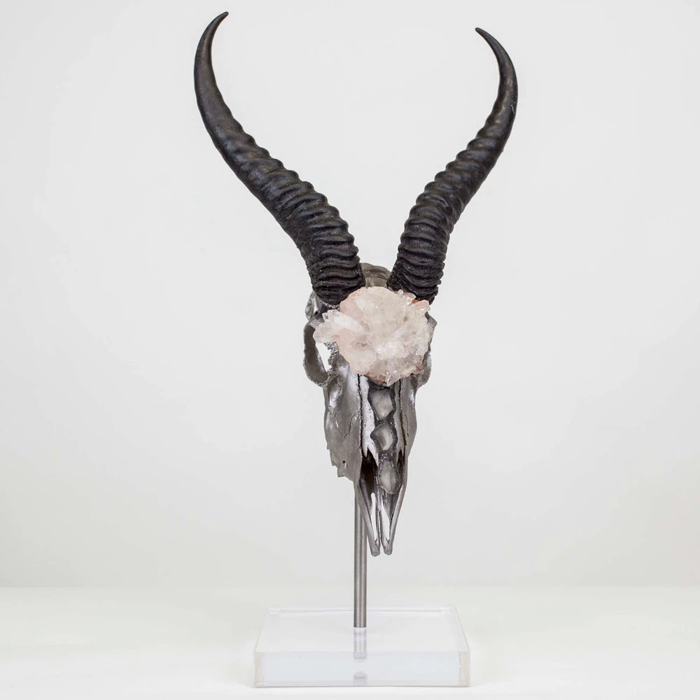 This authentic South African Sprinkbok skull is perfect for those who decorate outside the box. It features a hand embellishment of geode stones, and is mounted on a stand to prominently display it’s beauty.