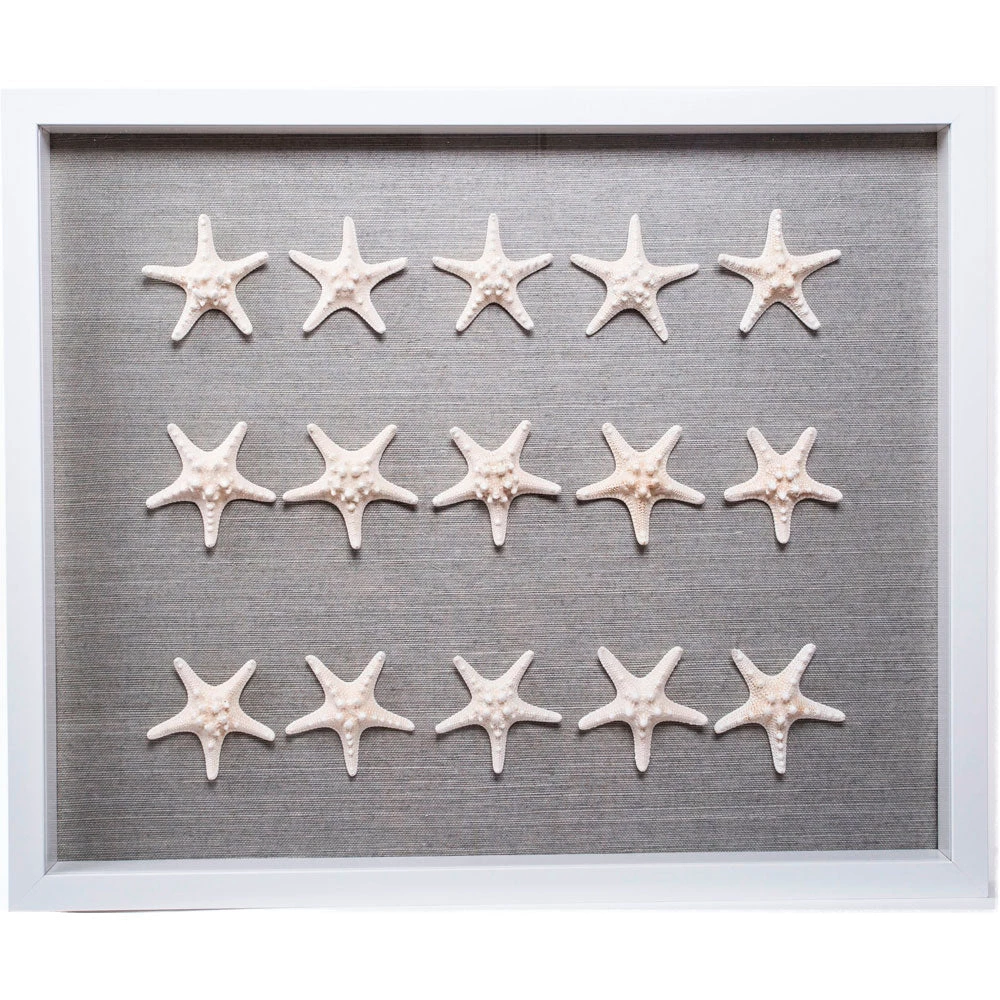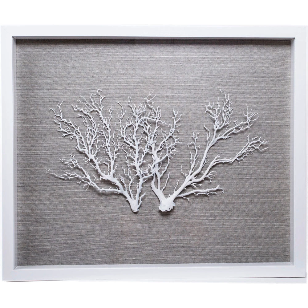 This hand-crafted shadow box features natural sealife mounted on a grass cloth backing set inside a deep 2” frame with a plexi glass front. This coastal-inspired art piece is impressive on its own, paired, or grouped together in gallery setting.
