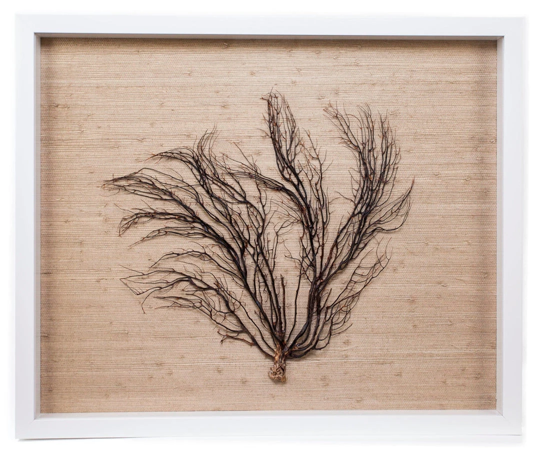 This hand-crafted shadow box features natural sealife mounted on a grass cloth backing set inside a deep 2” frame with a plexi glass front. This coastal-inspired art piece is impressive on its own, paired, or grouped together in gallery setting.
