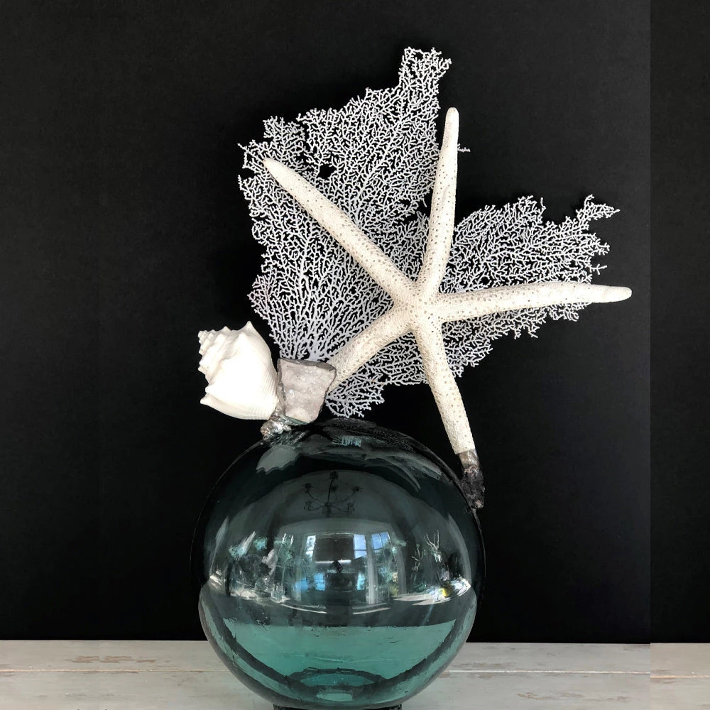 Compliment your coastal decor with this teal colored round glass float embellished with Starfish, Shells, and a White Seafan. The simple look of a glass bottom with the natural sealife on top is uniquely stylish. This gorgeous piece is a perfect addition to any room.