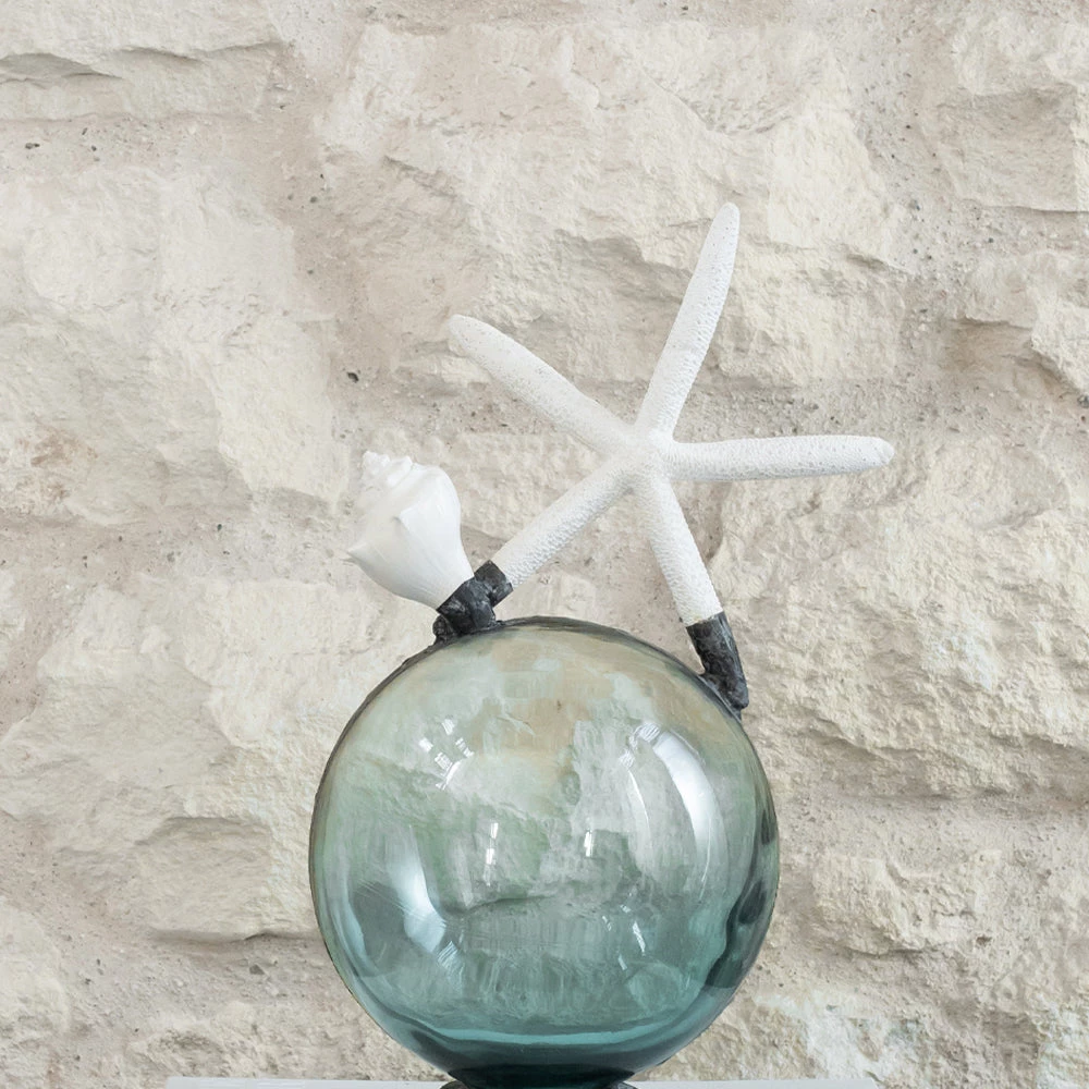 This teal colored round glass float is embellished with starfish, clamshell and a crystal. Simple, chic, and classy.
