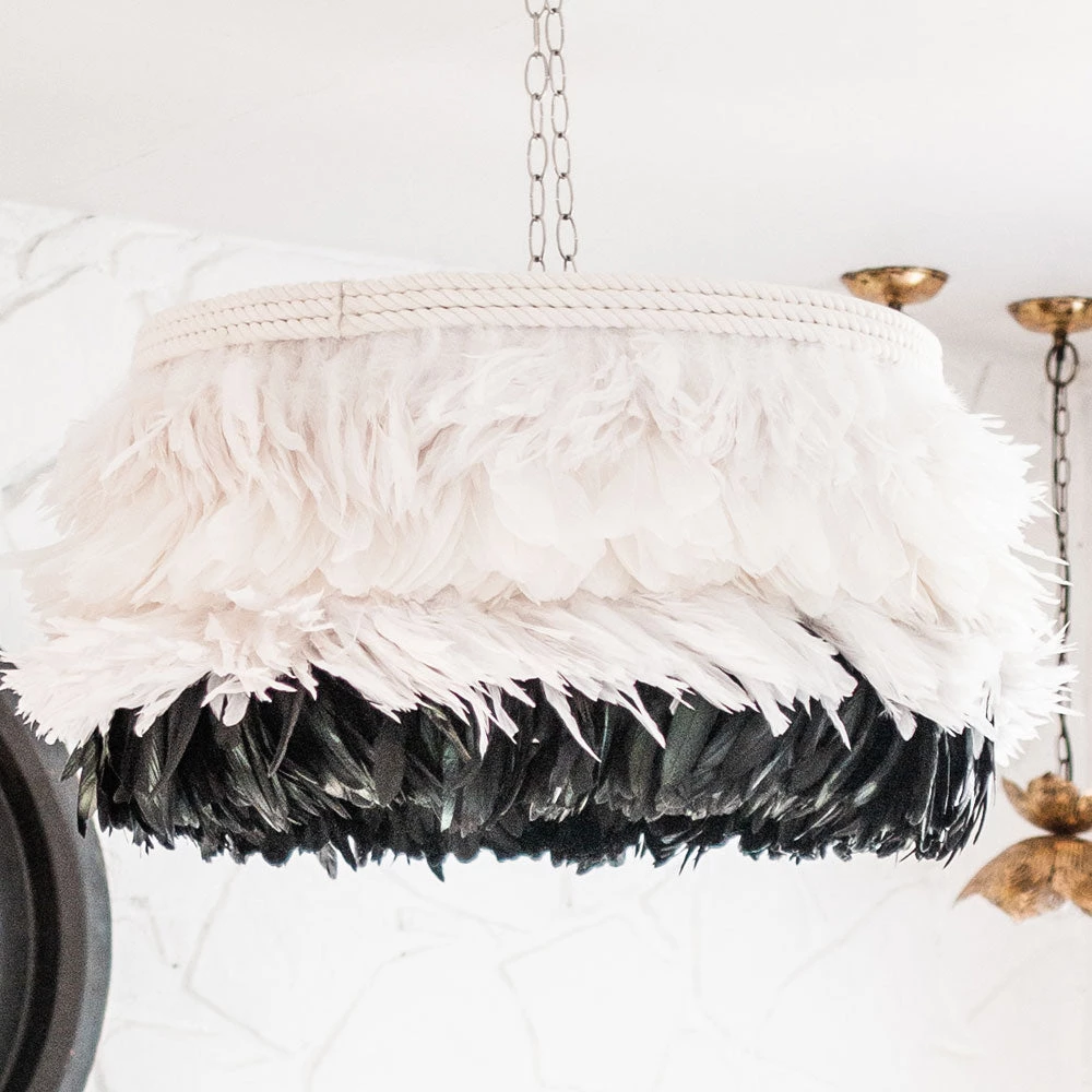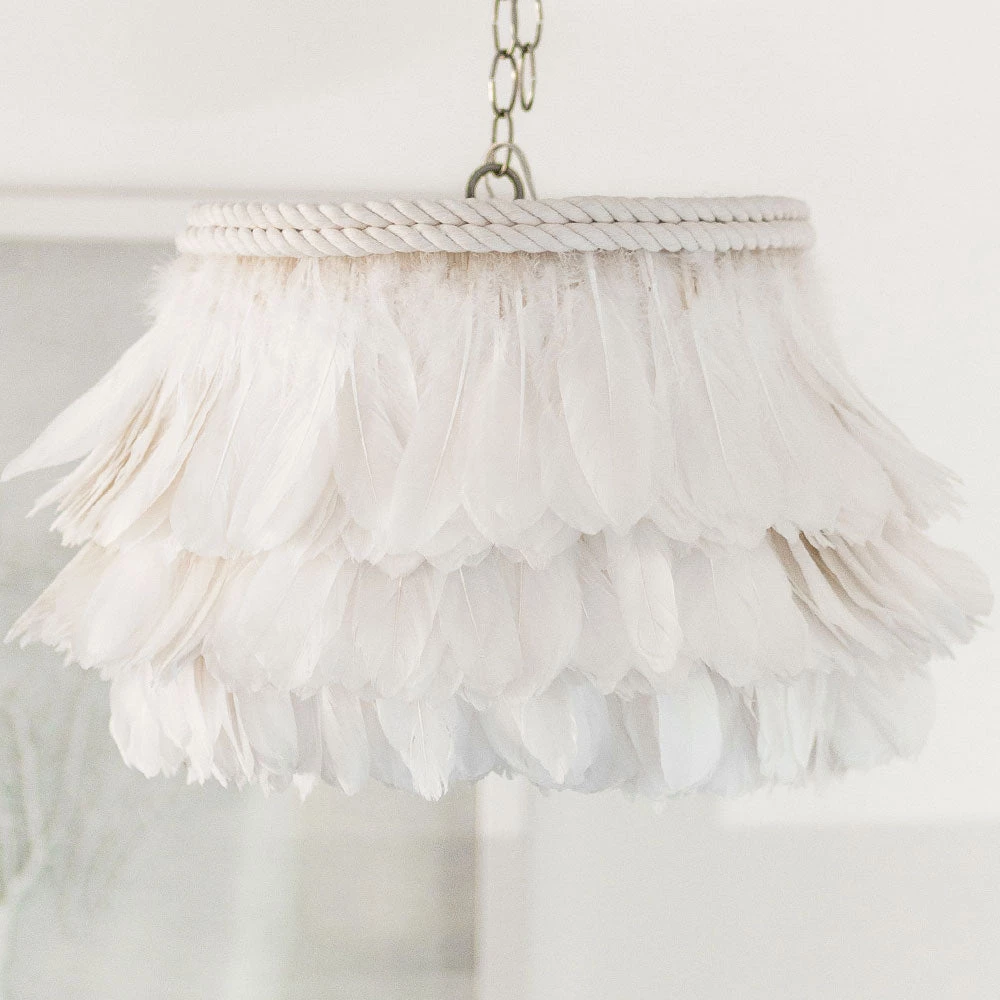 Looking for a little flair to light up your room? This feathered drum pendant is just the right statement piece with a classy and whimsical feel. We love the feathery texture, and the beautiful white color options it comes in. Depending on the size of your room you have three sizes to choose from.